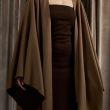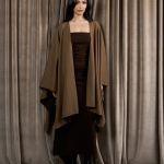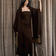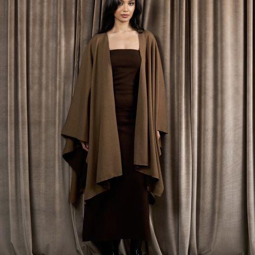 A brown strapless knit dress with a matching shawl cape that can be worn in different stylish ways. The shawl is reversible (brown and beige).
