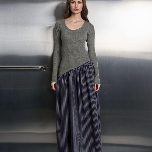This dress has a fitted cozy knit top complemented by an attached flowing striped cotton linen bottom. It’s suitable for ramadhan and daily outings!