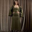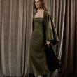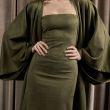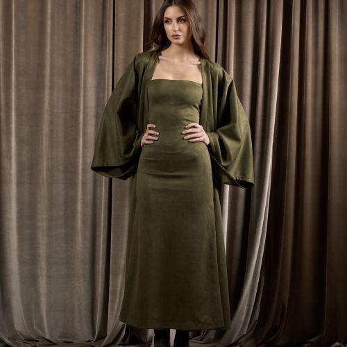 A suede set featuring an oversized bisht with a matching strapless dress. The bisht can be worn on its own or styled effortlessly with the dress for a complete look.