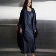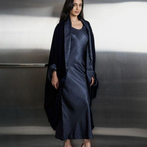 The 2-piece set includes a reversible jacket with one side in velvet and the other in satin, perfectly complemented by a matching satin dress.