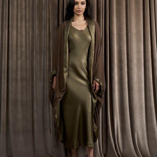 The 2-piece set includes a reversible jacket with one side in velvet and the other in satin, perfectly complemented by a matching satin dress.