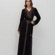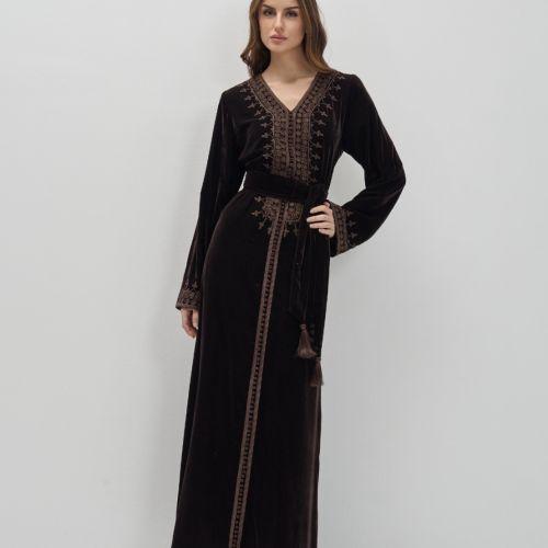 The morrocan inspired kaftan is crafted in soft silk velvet with detailed embroidery. It’s complemented with a matching belt that can be worn as a belt or scarf.